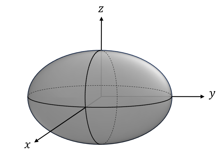 慣性モーメント $I$ は実対称な3×3行列であり、ざっくり言うと数値が大きいほど回転しにくいと解釈できます。剛体の形状が下図のような楕円体のとき、凸の向きに合わせてx,y,z軸をとると、$I$ は対角行列となります。$$ I = \pmatrix{I_x & 0 & 0 \\ 0 & I_y & 0 \\ 0 & 0 & I_z} $$