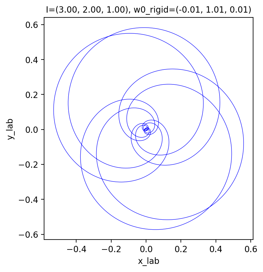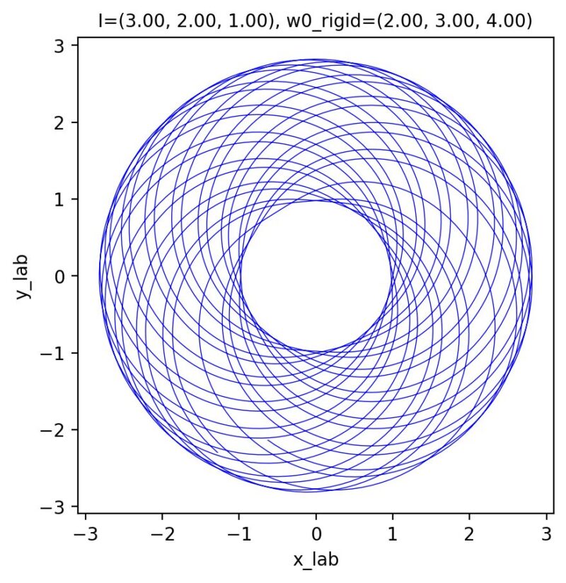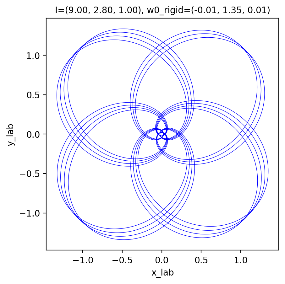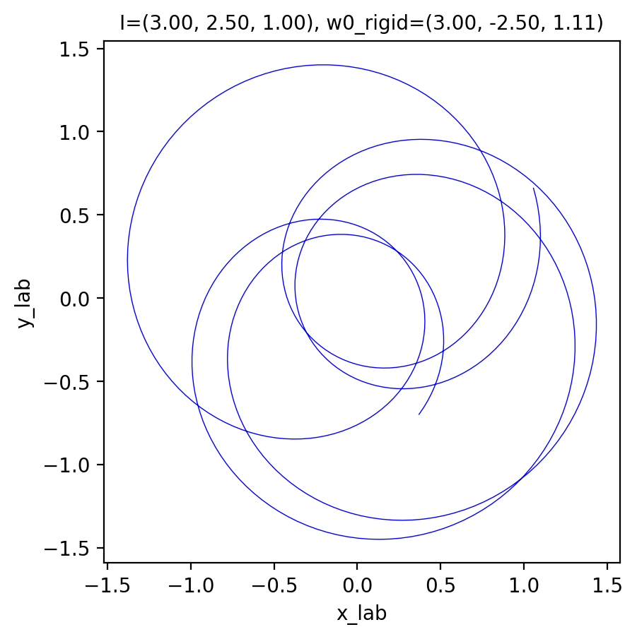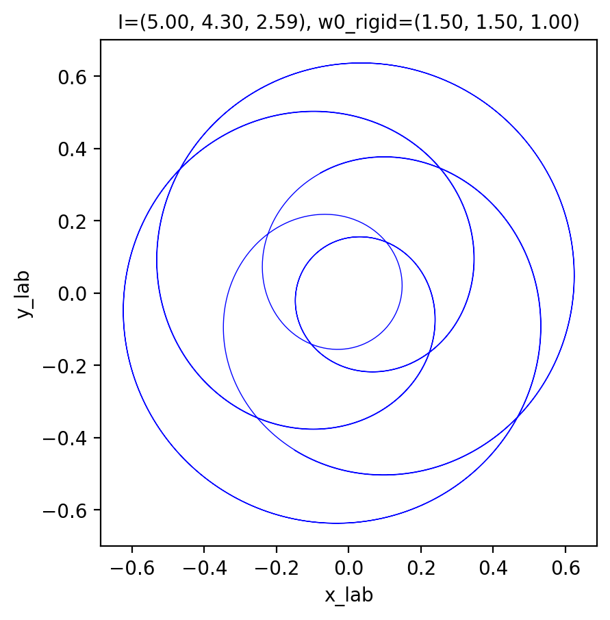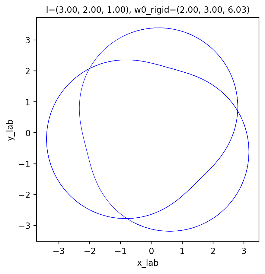 ついでに、慣性楕円体と不変平面の接点が慣性楕円体上に描く軌跡はポルホード(polhode)と呼びます。