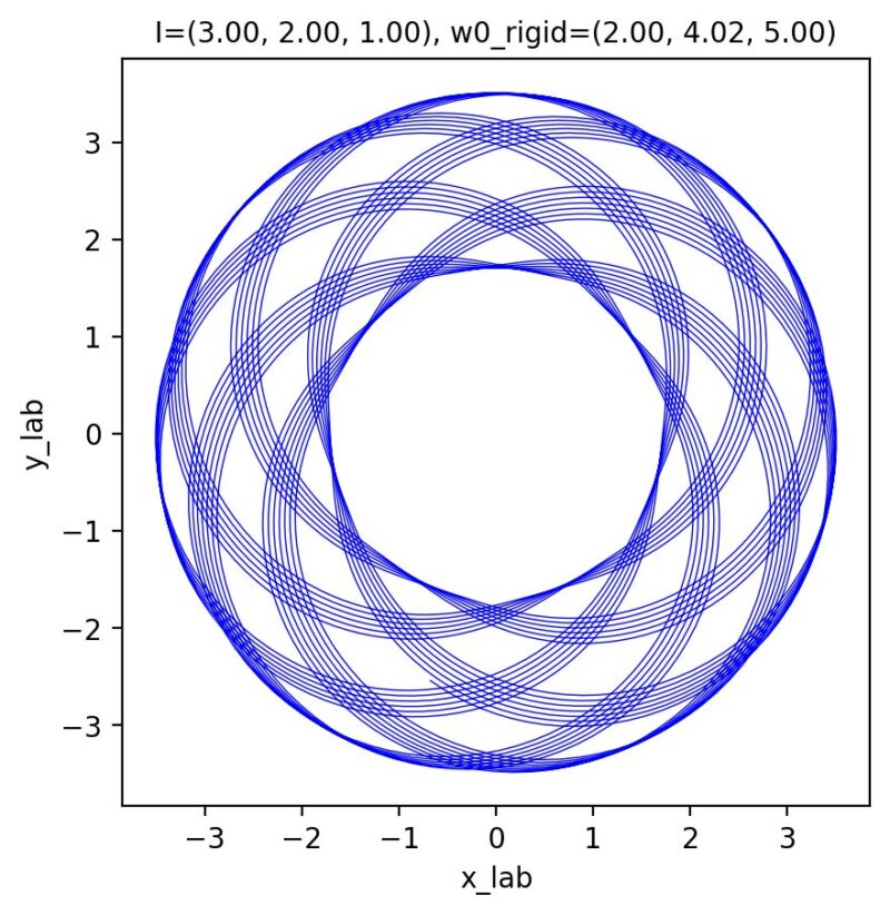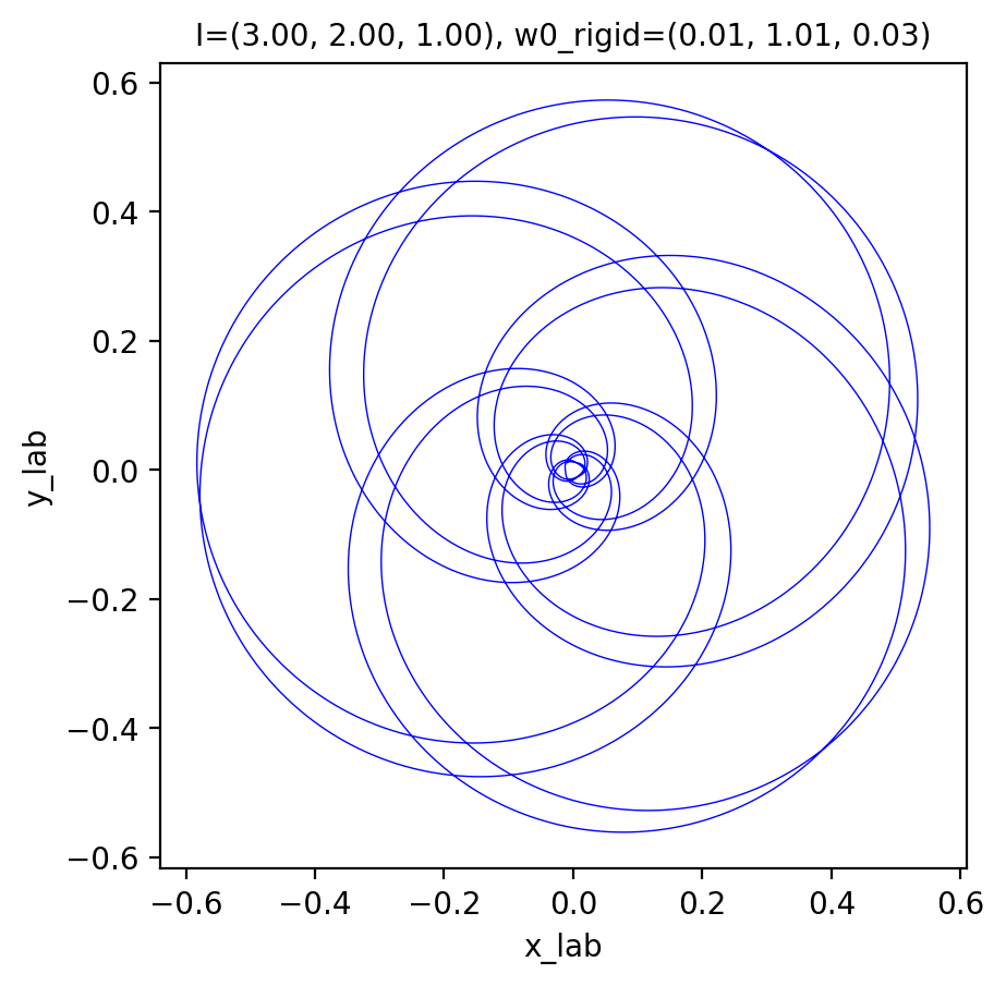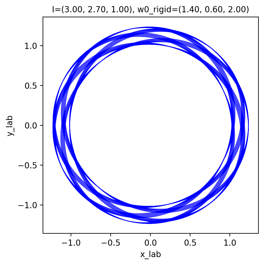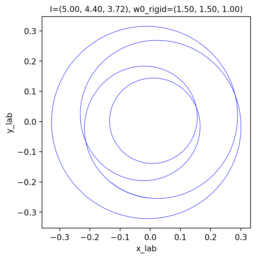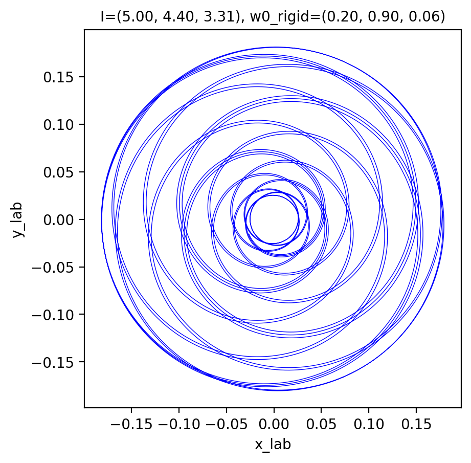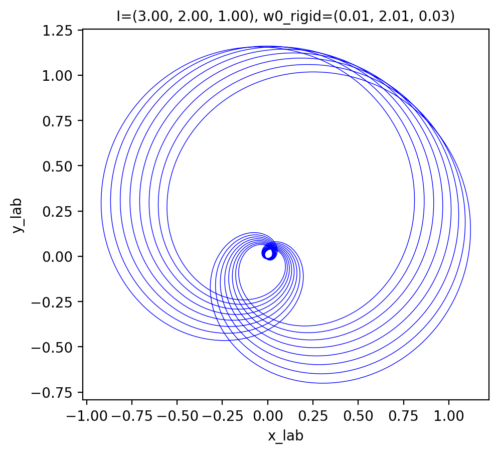 ついでに、慣性楕円体と不変平面の接点が慣性楕円体上に描く軌跡はポルホード(polhode)と呼びます。
