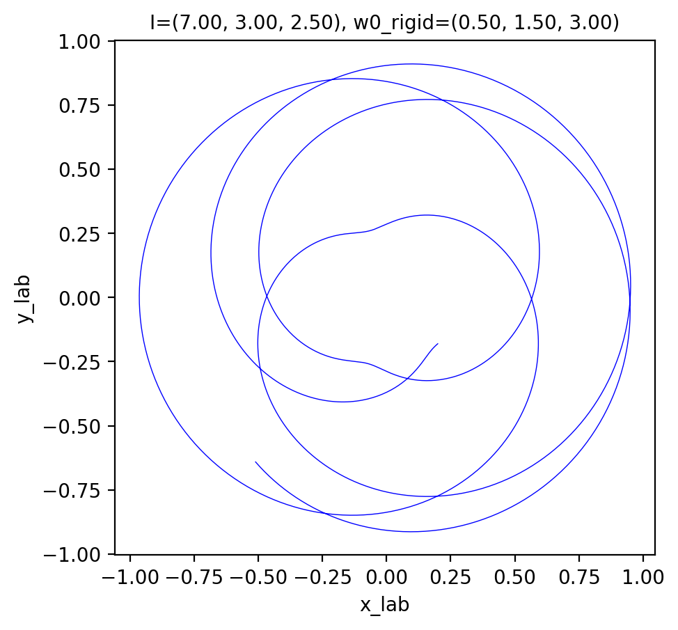 人が与えるパラメータとして、剛体系の主慣性モーメント $(I_x, I_y, I_z)$ と角速度の初期条件 $(\omega_{0x}, \omega_{0y}, \omega_{0z})$ の計6個を選びます。